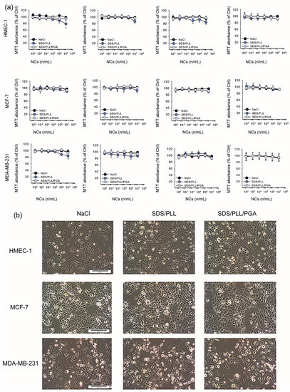 The cytotoxicity of PTX-loaded SDS/PLL and SDS/PLL/PGA NCs, empty NCs, and free PTX was analysed using the MTT and CellTiter-Glo® assays following 24, 48, 72, and 96 h incubation of the nanomaterials with three different cell lines (HMEC-1, MCF-7, MDA-MB-231). The cells were exposed to the examined NCs (SDS/PLL or SDS/PLL/PGA) and, in parallel, they were treated with equivalent concentrations of PTX alone, which ranged from 3.16 nM to 200 nM. Our analysis revealed that the NCs containing PTX were much more toxic to cells than the empty NCs. The empty NCs did not significantly decrease the survival rate of all examined cell lines (Figure 2a), even at the concentration of 1 × 106 NPs/mL. As shown in Figure 2b, we did not notice any morphological changes after the incubation of the cells with SDS/PLL or SDS/PLL/PGA NCs for up to 96 h. Thus, based on mitochondrial activity measurements, it was assumed that multicore polyelectrolyte NCs had no cytotoxic effect towards either normal HMEC-1 or cancerous MCF-7 and MDA-MB-231 cell lines.