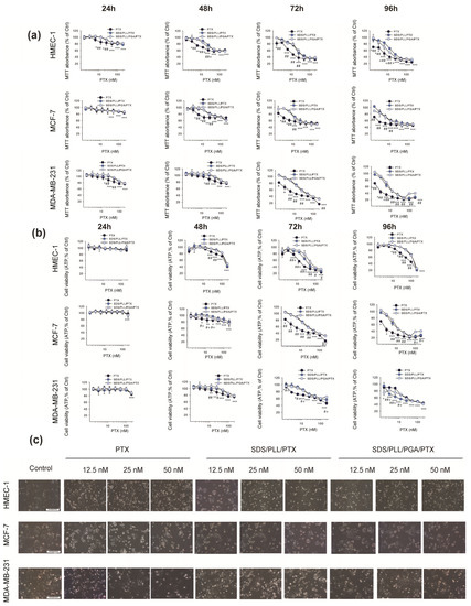 The cytotoxicity of free PTX, SDS/PLL/PTX, and SDS/PLL/PGA/PTX on HMEC-1, MCF-7, and MDA-MB-231 cells. (a,b) Viability of HMEC-1, MCF-7, and MDA-MB-231 cells was measured with the MTT assay (upper panel—(a)) or with CellTiter-Glo® (ATP levels; lower panel—(b)) following incubation of cells for 24, 48, 72, and 96 h with increasing concentrations of PTX-loaded polyelectrolyte multicore nanocarriers or PTX alone. The data are shown as percentage of untreated control cells and represent mean values ± SD from three independent experiments: * p < 0.05, ** p < 0.01, *** p < 0.001 statistically significant changes in comparison with the untreated control cells; # p < 0.05, ## p < 0.01 significant differences between probes treated with free PTX or drug encapsulated in the examined multicore nanocarriers; + p < 0.05, significant differences between samples incubated with SDS/PLL/PTX or SDS/PLL/PGA/PTX (c) Morphological changes in HMEC-1, MCF-7, and MDA-MB-231 cells were visualized using inverted phase contrast microscopy (Olympus IX70, Japan; magnification 100) after treatment of cells for 72 h with 12.5, 25, and 50 nM of PTX encapsulated in SDS/PLL or SDS/PLL/PGA or drug alone. The bar shown is 50 μm.
