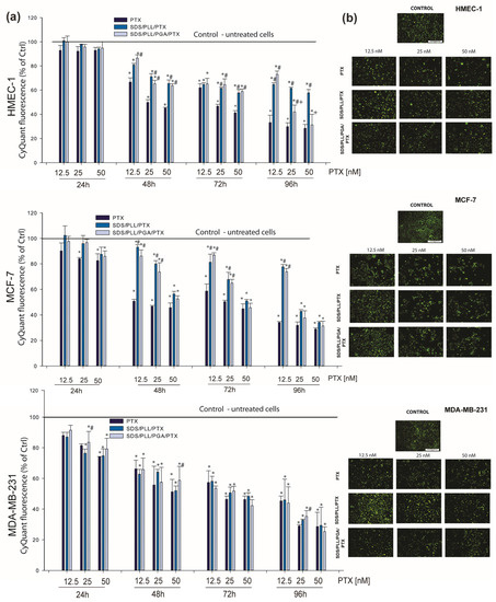 SDS/PLL/PTX and SDS/PLL/PGA/PTX reduce HMEC-1, MCF-7, and MDA-MB-231 cell proliferation. (a) DNA synthesis was measured in non-cancerous endothelial cells and breast tumour cell lines. The cells were treated with 12.5, 25, and 50 nM of PTX free or loaded in the investigated polyelectrolyte multicore nanocarriers for the indicated times at 37 °C in cell growth conditions. The examined cell proliferation was measured by incorporation of CyQUANT® DNA-binding dye for the final 30 min of incubation with the probe. Data are shown as mean ± SD from three independent experiments: * p < 0.05 statistically significant changes in comparison with the untreated control cells; # p < 0.05 significant differences between probes treated with free PTX or drug encapsulated in the examined multicore nanocarriers; +p < 0.05, significant differences between samples incubated with SDS/PLL/PTX or SDS/PLL/PGA/PTX. (b) Visualization of the number of proliferating cells stained with CyQUANT® DNA-binding dye. Images were captured at 20X (Olympus IX70, Japan; magnification 100) and the scale bar represents 50 µm.