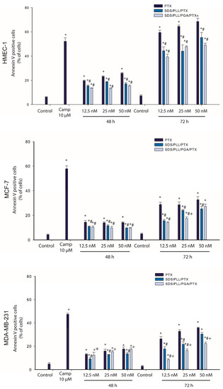 Externalisation of phosphatidylserine in HMEC-1, MCF-7, and MDA-MB-231 cell lines treated with PTX-loaded nanocarriers. Breast cancer cell lines and non-cancerous endothelial cells were incubated with 12.5, 25, and 50 nM of SDS/PLL/PTX, SDS/PLL/PGA/PTX, or PTX alone for 48 and 72 h. Camptothecin (10 µM) was used as a positive control. The figure shows the mean percentages (±SD) of Annexin-V binding cells. Additionally, the integrity of cellular membrane was determined by propidium iodide staining and for control cells, the percentage of Annexin-V binding cells and PI positive cells did not exceed 3%; * p < 0.05 statistically significant changes in comparison with the untreated control cells; # p < 0.05 significant differences between probes treated with free PTX or drug encapsulated in the examined multicore nanocarriers; + p < 0.05, significant differences between samples incubated with SDS/PLL/PTX or SDS/PLL/PGA/PTX.