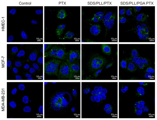 In the case of MCF-7 and MDA-MB-231 cells 48 h after incubation with SDS/PLL/PTX, SDS/PLL/PGA/PTX, or PTX alone, the percentage of Annexin-V binding cells reached approximately 12%, 11%, and 13%, respectively. When incubation was prolonged for up to 72 h, it was revealed that the externalisation of phosphatidylserine was approximately two-fold higher (around 35%) in both breast cancer cell lines exposed to all forms of PTX. In non-cancerous HMEC-1 cells, a maximal growth in the number of Annexin V binding cells was also observed after 72 h exposure to free PTX (66.5%), SDS/PLL/PTX (54.3%), and SDS/PLL/PGA/PTX (48.2%). In parallel, PI staining was performed to assess cell membrane integrity and the number of PI positive cells did not exceed 10% in both normal and cancer cells. In all cells exposed to SDS/PLL/PTX or SDS/PLL/PGA/PTX, a progressive increase in the morphological hallmarks accompanying programmed cell death was observed. In addition to flow cytometry measurements, cells were also stained with Hoechst 33258 (Figure 6). Apparent cellular shrinkage, chromatin condensation and marginalization, and the formation of apoptotic bodies and their fragmentation were seen after 48 h incubation with PTX encapsulated in SDS/PLL or SDS/PLL/PGA NCs or free PTX.