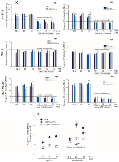 Keeping in mind that the observed executive stage of apoptosis requires the activation of many enzymes, the recruitment of caspase-3 or -7 after cell treatment with PTX-loaded NCs was assessed. Estimations of the protein level, changes in the enzyme activity, as well as the transcriptional level by the measurement of the caspase 3′ mRNA copies were performed. The results presented in Figure 7a indicate that SDS/PLL/PTX as well as SDS/PLL/PGA/PTX activated caspase-3 both in MDA-MB-231 cancer and HMEC-1 normal cells. MCF-7 cells do not express caspase-3 [33].