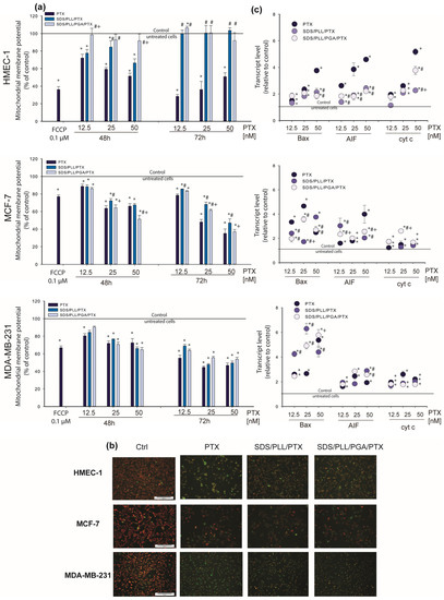 Keeping in mind that MTT reduction to formazan takes place in mitochondria, our next step was to measure the alteration of the mitochondrial membrane potential in cells treated with PTX alone or PTX encapsulated in SDS/PLL/PGA NCs. A dose-dependent irreversible effect of PTX-loaded NCs was noticed only in MCF-7 and MDA-MB-231 cells, whereas in the normal HMEC-1 cell line, a marked drop in Δψm was observed mainly after free PTX treatment. The alterations in the mitochondrial response of cancer and normal cells towards the tested formulation of PTX agreed with the expression of genes crucial for maintaining mitochondrial homeostasis. We discovered that the alterations in Bax, AIF, and cytochrome c mRNA levels were responsible for mitochondrial apoptosis. Similar observations were obtained by Ren et al., who noted that in canine mammary gland tumour cells, PTX induced the overexpression of the pro-apoptotic protein Bax [54]. These changes were responsible for triggering mitochondria-dependent apoptosis through the disruption of Δψm and the consequent release of cytochrome c from mitochondria into the cytoplasm and cleavage of the caspase-3 protein [55].