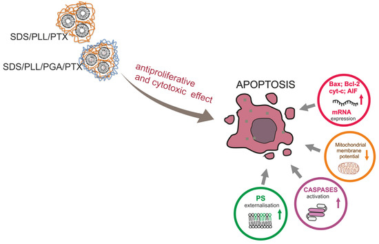 In conclusion, our data demonstrate that PTX encapsulated in SDS/PLL/PTX and SDS/PLL/PGA/PTX NCs displays cytotoxic properties and suppresses the proliferation of cancer cells through the induction of programmed cell death (Figure 9). It was identified that NCs loaded with PTX effectively kill cancer cells, especially when incubation with NCs was prolonged for up to 72 h. Moreover, the high sensitivity of triple negative cancer cells towards PTX encapsulated in the SDS-based polyelectrolyte nanocarriers showed examined nanocapsules as good candidates for further biomedical studies.