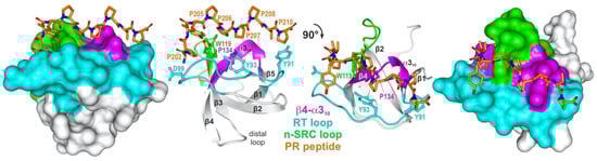 The SRC homology 3 (SH3) domain was first described in 1988 as a region of approximately 60 amino acids found in different intracellular signaling proteins, such as SRC and PLC [1,2]. SH3 domains are arranged as small protein modules in a compact β-barrel fold made of five β-strands connected by RT, n-SRC, distal loops, and a 310-helix (Figure 1) [3]. Thousands of SH3 domains present in eukaryotes, prokaryotes, and viruses have been investigated and characterized as modules mediating the protein–protein interaction/association [4,5]. SH3 domain-mediated protein–protein interactions have significant diversification as the binding partners regulate almost all essential cellular functions, including cell survival, proliferation, differentiation, migration, and polarity. Moreover, findings underscore the significance of SH3 domains in shaping protein–protein interaction, their potential influence on protein folding and positioning, their impact on cellular phenotypes, and the essential role they play in protein function [6]. Mutations and malfunctions of the SH3 domain can lead to significant neurological defects, cancer, and infectious diseases [7,8,9].