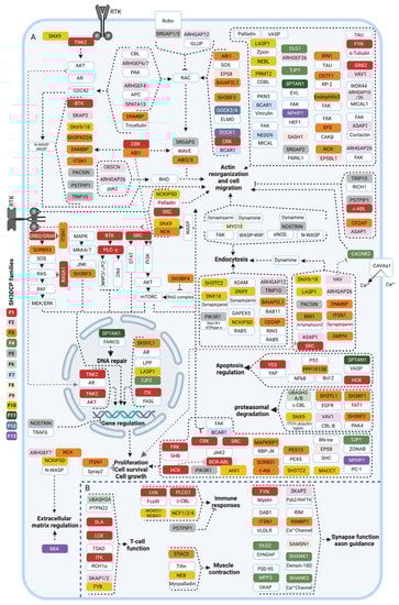 SH3DCPs also control the molecular functions of enzymes, receptor activities, and transport processes [88,89]. SH3 domains are protein binding modules in enzymes like phospholipase Cγ [90]. Adaptor and docking SH3DCPs are involved with influencing signaling pathways, including non-receptor tyrosine kinases of the SRC family, for the regulation of its catalytic activity and/or mediating interactions [91]. It is important to mention that SH3DCP can enter the nucleus under certain circumstances. One such example is when CASK acts as a molecular regulatory coactivator of Tbr-1 to induce transcription of T-element-containing genes, such as reelin, which is required for cerebrocortical development [92]. However, the CASK-GK domain is enough for this interaction, and further research is needed to fully understand the involvement of indirect effects or interactions between other proteins with the SH3 domain in the co-activation of Tbr-1 by CASK. In another example, through the SH3 domain, SPTAN1 (αII-spectrin) could potentially contribute to the repair of DNA interstrand cross-links in the nucleus [93]. Hence, this implies that the SH3 domain serves as a mediator of complex formation, linking signaling proteins at the right time and in the right place with the corresponding signaling pathways [31]. Figure 2 depicts the formation of various protein complexes through SH3 domain-mediated protein–protein interactions, which bind to partner proteins and play a general role in different signaling pathways. Biologically, the roles of proteins from SH3DCPs are vastly diverse, ranging from signaling pathways related to proliferation, cell survival, cell growth, actin reorganization, cell migration, endocytosis, apoptosis regulation, and proteasome degradation (Figure 2A). SH3 domains mediate the involvement of numerous proteins both upstream and downstream of the EGFR-receptor tyrosine kinase (RTK). For instance, GRB2, NCK, BTK, and SRC SH3 domains interact with EGFR, resulting in the activation of downstream pathways involved in cell proliferation and actin reorganization. In addition, a huge number of SH3CPs regulate actin dynamics and cell migration via the direct mediation of SH3 domains. The role of complex formations, mediated by SH3 domains, is also clear in Vesicular trafficking. Moreover, several complexes that are mediated by SH3 also contribute to T-cell function, immune responses, muscle contraction, and synaptic activity (Figure 2B).