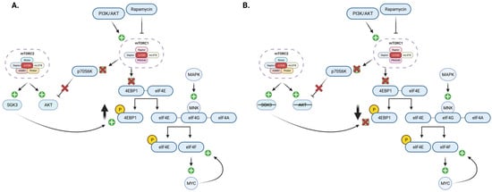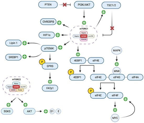 mTOR is a serine/threonine kinase which exists as mTOR complex 1 (mTORC1) and 2 (mTORC2). Its activation involves the phosphoinositide 3-kinase/protein kinase B (PI3K/AKT) pathway, which is activated by tyrosine kinase receptors, insulin receptor substrate 1 or 2 (IRS-1 or IRS-2), RAS protein, and several other G-protein-coupled receptors. mTORC2 plays an important role in full activation of AKT, thus inhibiting proteolysis of Cyclin D1/E, as well as the activation of serum- and glucocorticoid-inducible kinase 3 (SGK3) [125,126]. Cyclin D1 is implicated in tumorigenesis, and Cyclin E is a prognostic marker in breast cancer [127]. Following activation by the PI3K/AKT pathway, mTORC1 regulates the assembly of the eukaryotic translation initiation factor 4F (elF4F) complex by mediating phosphorylation of 4E-binding proteins (4EBP1), as well as the activation of ribosomal protein S6 kinase 1 (p70S6K) [128]. 4EBP1 dissociates from elF4E, which is then free to bind to elF4G, resulting in elF4F formation [128]. In addition to mTORC1, p38 MAPK signaling pathways activate MAPK-interacting kinases (MNKs), which bind to elF4G and phosphorylates elF4E [128]. The MYC oncoprotein mRNA is a translational target of the elF4F complex. MYC also promotes elF4E transcription, further upregulating its own translation [128]. Both elF4E and elF4F are implicated in neoplasia. It is hypothesized that elF4E mediates tumorigenesis in cancers with uncontrolled mTORC1 activation, as seen in patients with phosphatidylinositol 3-kinase (PI3K) activation mutations, phosphatase and tensin homolog (PTEN) loss, as well as deletions in tumor suppressor proteins tuberous sclerosis complex (TSC1 and TSC2) [125,129]. elF4E is overexpressed in a range of human cancers, including breast cancer, and in most cases is associated with increased recurrence and decreased survival [128]. Furthermore, Zindy et al. demonstrated that the elF4F complex may be a vital mediator of breast cancer resistance to anticancer drugs that target HER2 and EGFR [130].