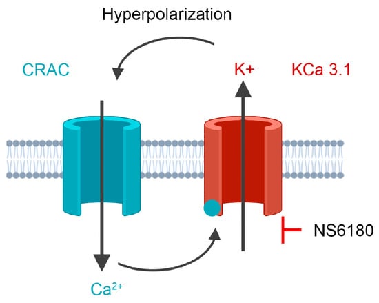 - Nicolaou, S.A.; Neumeier, L.; Peng, Y.; Devor, D.C.; Conforti, L. The Ca2+-activated K+ Channel KCa3.1 compartmentalizes in the immunological synapse of human T lymphocytes. Am. J. Physiol. Cell Physiol. 2007, 292, C1431–C1439. [Google Scholar] [CrossRef]