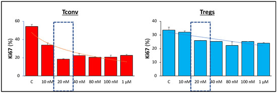 Since AZD8055 has not been previously used in Treg cell culture/expansion, we first determined the optimal concentration of AZD8055 in cell culture to selectively inhibit Tconv proliferation while minimizing the effects on CD25+ Treg cell expansion. Treg and homologous Tconv cells were exposed to increasing doses of AZD8055 ranging from 10 nM to 1 µM, and the expression of Ki67 nuclear protein was analyzed after 24 h as a proliferation marker. The results established 20 nM as the minimum effective dose of AZD8055 that promotes the maximum selective activity against Tconv (Figure 1). Accordingly, we set 20 nM as the default concentration of AZD8055 used in CD4+CD25+ Treg-enriched cells throughout the study.