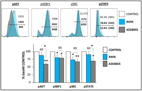 AZD8055 in mTOR and IL2-R in Treg cell signaling. Cells were expanded in Treg cell medium with vehicle control, RAPA (100 nM) or AZD8055 (20 nM). After 5 days, cells were collected and analyzed by flow cytometry for the expression of the activated forms of the mTORC2 substrate, AKT (pAKT); the mTORC1 substrate 4EBP1 (p4EBP1); the IL2-R-dependent phosphorylation of STAT5 (pSTAT5); and the activated form of SRC kinase (pSRC). The top panels show representative histogram panels with the expression profiles of vehicle control (dashed, empty histograms)-, RAPA (blue-filled)-, and AZD8055 (grey filled histograms)-treated Treg cells. Each panel includes the GeoMFI values (pSTAT5 also percentages of positive cells) for each condition. Control values are shown in regular font, RAPA-treated in italic bold and AZD8055-treated in standard bold font. The bottom bar panel illustrates the comparative average protein expression ± SD pooled from three different experiments (n = 3). The expression of each individual protein is depicted as a percentage of its corresponding control (untreated) condition. * p < 0.05 and ** p < 0.001 indicate significant differences identified by one-way ANOVA, followed by Dunnett’s post hoc test. NS indicates no significant differences between treatments.