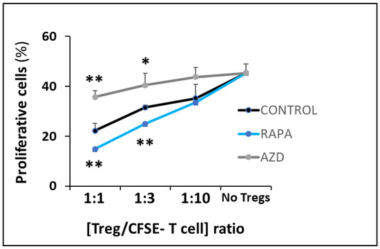 AZD8055 in Treg cell function. Loss of suppressor activity in peripheral Treg cells after 3-day-exposure to AZD8055 (grey dots) compared to RAPA-treated (blue dots) or untreated (control) cells (black dots). Suppressor function of Treg cells was determined by the inhibition of CFSE-labeled T cell expansion in a 4-day mixed lymphocyte reaction with different Treg/CFSE-labeled cell ratios. Results are shown as mean ±SD of proliferative cells evaluated by flow cytometry from three independent experiments. * p < 0.05 and ** p < 0.001 indicate significant differences determined by one-way ANOVA and Dunnett’s post-hoc test.