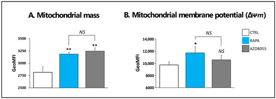 AZD8055 in mitochondrial integrity. (A) MitoTracker Green FM (Molecular Probes, Invitrogen) was used to measure mitochondrial mass by flow cytometry analysis. Results are expressed as mean fluorescence intensity (MFI) and show the significant increase of mitochondrial mass in AZD- and RAPA-treated cells compared to untreated, control cells, but no differences between the effects induced by the drugs. (B) Δψm was measured by flow cytometry analysis with TMRE (Invitrogen) staining. Each condition was tested with the corresponding control of specificity by pre-treatment of cells with the mitochondrial uncoupler FCCP (5 µM) to ensure the specificity of the Δψm measurements. The results show a significant Δψm increase only in RAPA-treated and not AZD-treated cells. ** p < 0.001 and * p < 0.05 indicate significant differences as measured by one-way ANOVA and Dunnett’s test. NS: no significant differences.