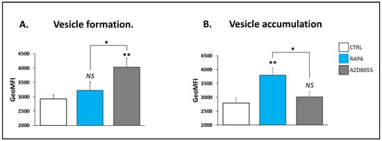 We demonstrated that both drugs promoted similar increases in mitochondrial mass, a phenomenon reportedly promoted by in RAPA in Treg and other cell types [16,17,26]. In our previous studies, the enhanced mitochondrial mass in RAPA-treated Treg cells was linked to hyperpolarization of the mitochondrial membrane, increase in autophagy flux, and higher cell oxidative metabolism and glycolytic capacity [16,17]. However, in the current study, the changes in mitochondrial mass induced by AZD8055 treatment did not involve a corresponding increase in mitochondrial membrane potential (Figure 5), suggesting an early loss of mitochondrial function efficacy consistent with a status of functional mitochondrial stress [27]. Our results also revealed that AZD8055 treatment promoted early autophagosome formation but lowered autophagosome accumulation upon autolysosome inhibition (Figure 6). A similar pattern of disturbed autophagic flow has been reported in oxidative-stress mitochondrial damage induced in vascular endothelial cells [28], which leads to the inability of eliminating non-functional organelles. In a previous study, we showed that the accumulation of dysfunctional mitochondria may result in the progressive deterioration of Treg cell activity and fitness [19].
