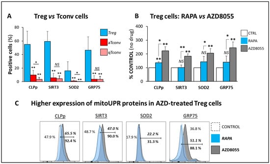 AZD8055 in mitoUPR response. The regulation of mitochondrial unfolded protein response (mitoUPR) was determined by the analysis of the protein expression levels of mitochondrial proteins Caseinolytic peptidase-P (CLPp), the chaperone Glucose-Regulated Protein 75 (GRP75), Sirtuin-3 (SIRT3) and the antioxidant manganese Superoxide Dismutase (SOD2). (A) The expression of all mitoUPR proteins was measured from five different biological samples of freshly isolated Treg cells compared to activated (CD25+) or quiescent (CD25−) conventional T cells. Pooled results demonstrated that the expression of all mitoUPR proteins was significantly higher in Treg cells (blue-filled bars) compared with activated (aTconv, red-filled bars) and quiescent (qTconv, maroon-filled bars). (B) The expression of mitoUPR proteins in Treg cells show increased fluorescent intensity of all mitoUPR expression proteins tested in Treg cells cultured in the presence of AZD8055 for 48 h (grey-filled bars) compared with RAPA cultured cells (blue-filled bars) and control vehicle-treated (unfilled bars) measured from three biological samples. Pooled results demonstrated that the expression of all mitoUPR proteins was significantly higher in AZD-treated compared to RAPA-treated and control cells. (C) Representative flow cytometry histogram overlay plot showing increased fluorescent intensity of all mitoUPR expression proteins tested in Treg cells cultured in the presence of AZD8055 for 48 h (grey-filled histograms) compared with RAPA cultured cells (blue-filled histograms) and control (vehicle) cells (dashed, empty histograms). Intra-panel numbers show percentages of positive control cells in regular font, RAPA-treated in italic, and AZD-treated in standard font. * p < 0.05 and ** p < 0.001 indicate significant difference between treatment conditions determined by one-way ANOVA and Dunnett’s post-hoc test. NS differences did not reach the levels of significance (p > 0.05).