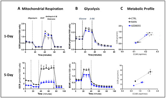 To evaluate the effects of AZD on the bioenergetic status of the Treg cells, we measured oxygen consumption rates (OCR, a measure of mitochondrial respiration) and extracellular acidification rates (ECAR, an indicator of glycolytic cell function). In the early phase of drug exposure (1-day culture), mitochondrial respiration demonstrated similar sensitivity to AZD and RAPA, while the alteration of the glycolytic pathway was more noticeable in AZD-treated than in RAPA-treated cells (Figure 8 top panels and Figure S2). After 5-day exposure, the differences between the mTOR inhibitor treatments were steep. AZD-treated T cells exhibited a prominent reduction in both OCR and ECAR (Figure 8 left and central bottom panels and Figure S2). The progression of the cellular metabolic profiles illustrates the lower bioenergetic potential of the 5-day AZD-treated cells compared with that of 1-day AZD-treated cells and 5-day RAPA-treated cells (Figure 8C). These results are consistent with a significant functional mitochondrial deterioration and support the inability of AZD-treated cells to meet the energy demands of functionally competent Treg cells.