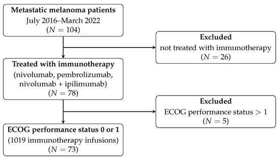 Our dataset comprises 104 patients with metastatic melanoma, of which 78 received immunotherapy with either nivolumab, pembrolizumab, or nivolumab plus ipilimumab. Out of these, only 73 patients had an ECOG PS of 0–1 at the start of immunotherapy. This patient cohort completed a total of 1019 infusions between July 2016 and March 2022 (Figure 1). All data were pseudoanonymized.