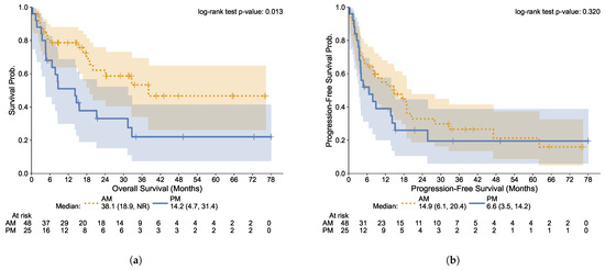 Kaplan–Meier Curves of Overall and Progression-Free Survival by AM/PM Treatments. (a) Overall Survival; (b) Progression-Free Survival. AM (Morning) group: patients with <75% of infusions after 2 p.m.; PM (Afternoon) group: patients with ≥75% of infusions after 2 p.m. Lines: Kaplan–Meier nonparametric estimates of survival rates; shaded regions: 95% confidence intervals.