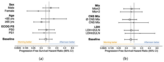 Forest Plot for Hazard Ratio of Progression-Free Survival. (a) By Patient Characteristics; (b) By Tumor Burden. AM (Morning) group: patients with <75% of infusions after 2 p.m.; PM (Afternoon) group: patients with ≥75% of infusions after 2 p.m. Hazard ratio of AM vs. PM treatment groups estimated using Cox regressions; squares: estimated values (size proportional to sample size); whiskers: 95% confidence intervals. ECOG PS: Eastern Cooperative Oncology Group performance status. Mtx: number of metastatic sites. (∅) CNS Mtx: presence (absence) of metastases in the central nervous system. LDH: lactate dehydrogenase; ULN: upper limit of normal.