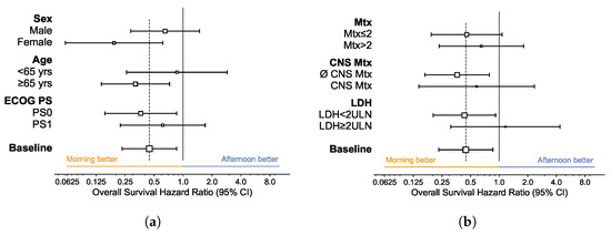 Forest Plot for Hazard Ratio of Overall Survival. (a) By Patient Characteristics; (b) By Tumor Burden. AM (Morning) group: patients with <75% of infusions after 2 p.m.; PM (Afternoon) group: patients with ≥75% of infusions after 2 p.m. Hazard ratio of AM vs. PM treatment groups estimated using Cox regressions; squares: estimated values (size proportional to sample size); whiskers: 95% confidence intervals. ECOG PS: Eastern Cooperative Oncology Group performance status. Mtx: number of metastatic sites. (∅) CNS Mtx: presence (absence) of metastases in the central nervous system. LDH: lactate dehydrogenase; ULN: upper limit of normal.