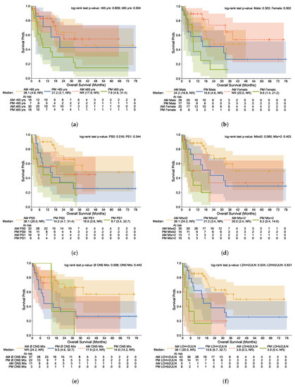 Regarding the relative effectiveness of AM treatment allocation on OS, we detect meaningful differences across subgroups. Not only is AM vs. PM treatment allocation conducive to significant effects on HR for (i) female patients (HR 0.19 [95% CI 0.06–0.62]), and (ii) older patients (HR 0.31 [95% CI 0.14–0.72])—and not for male and younger patients—but we also find a significant effect for patients with an initial low tumor burden (fewer metastatic sites [HR 0.45; 95% CI 0.19–1.07]), less CNS involvement [HR 0.36; 95% CI 0.17–0.79], and LDH below 2ULN [HR 0.43; 95% CI 0.20–0.92]), but not for those with worse disease burden at the outset of immunotherapy. For completion, in Figure 5 we report the Kaplan–Meier estimates of OS disaggregated by patient characteristics (age (a), sex (b), and ECOG PS (c)) and initial disease burden (number of metastatic sites (d), presence of metastases in the central nervous system (e), and LDH values (f)).