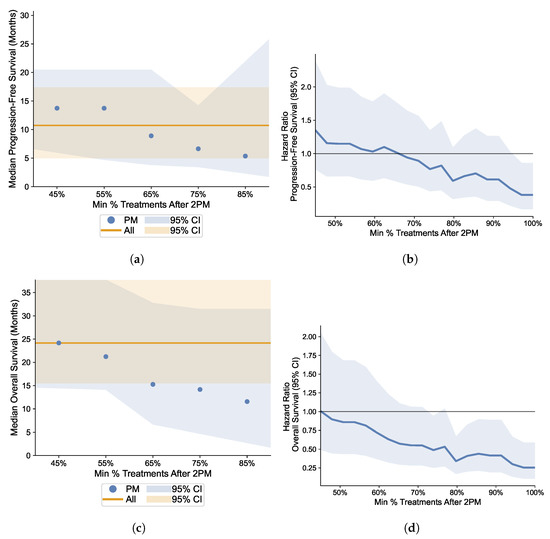Impact of Fraction of PM Treatments. (a) Median Progression-Free Survival; (b) Hazard Ratio for Progression-Free Survival; (c) Median Overall Survival; (d) Hazard Ratio for Overall Survival. AM (Morning) group: patients with <75% of infusions after 2 p.m.; PM (Afternoon) group: patients with ≥75% of infusions after 2 p.m. Lines in panels (a,c): Kaplan–Meier nonparametric estimates of median PFS (a) and median OS (b) with varying cutoffs for PM treatment group (x-axis); shaded regions: 95% confidence intervals. Lines in panels (b,d): Cox regression estimates of hazard ratios for PFS (b) and OS (d) comparing AM vs. PM treatment groups with varying cutoffs for PM treatment group (x-axis); shaded regions: 95% confidence intervals.