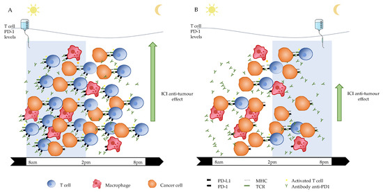 Hypothetical Model for Differences of ICI Anti-Tumor Effect according to the Circadian Timing of Infusion. Panel (A): hypothetical immune setting and ICI anti-tumor effect during the morning. Panel (B): hypothetical immune setting and ICI anti-tumor effect during the afternoon. ICI: immune checkpoint inhibitor. PD-1: programmed death protein 1. PD-L1: programmed death ligand 1. MHC: major histocompatibility complex. TCR: T cell receptor.