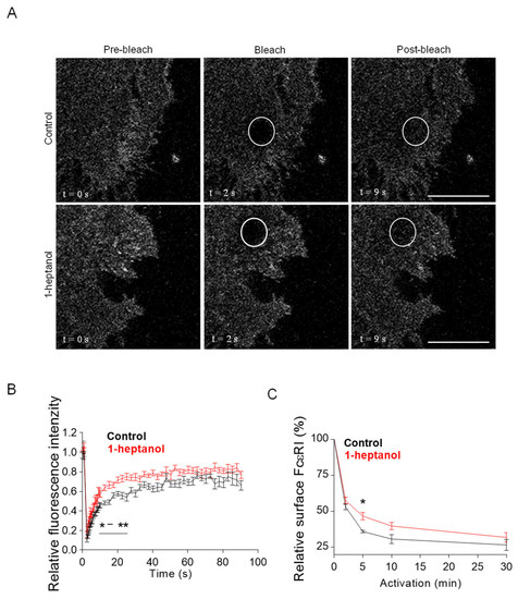The amphipathic properties of 1-heptanol result in its efficient intercalation into the cell plasma membrane and activation of membrane cholesterol [18]. This process is accompanied by exposure of cholesterol to its oxidases [18,19] and hyperfluidization of cell membranes associated with domain segregation [31]. Because cholesterol in the membrane is crucial for proper FcεRI signaling [11,50,54], we investigated the mobility of FcεRI in the plasma membrane of 1-heptanol-treated cells. For these experiments, we used RBL-2H3 cells labeled with IgE-FITC and measured the dynamics of FcεRI diffusion with FRAP (Figure 2A). Data summarized in Figure 2B show that FcεRI mobility was significantly enhanced in cells exposed to 2.5 mM 1-heptanol at 9–27 s after photobleaching. Quantification of the acquired FRAP curves yielded an FcεRI diffusion coefficient of 0.16 ± 0.06 µm2 s−1 in control cells, compared to 0.32 ± 0.1 µm2 s−1 in 1-heptanol-treated cells; the dissociation (koff) rate was 0.19 ± 0.04 s−1 in control cells and 0.24 ± 0.03 s−1 in cells exposed to 1-heptanol. Consistently, 31.40 ± 3.91% of FcεRI was present in the immobile fraction in control cells compared to 23.50 ± 2.85% in 1-heptanol exposed cells.