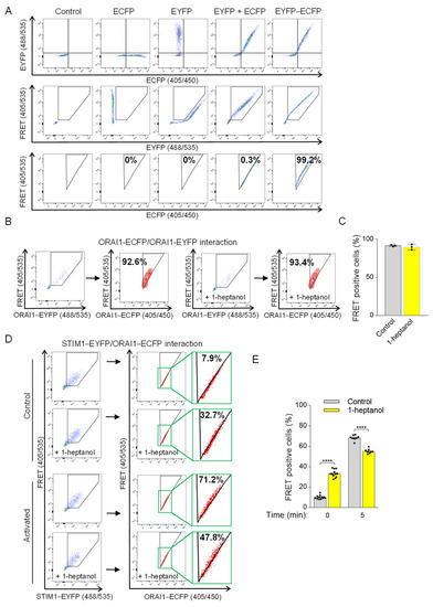To measure 1-heptanol-induced changes in STIM1/ORAI1 coupling, we introduced a flow cytometry-based FRET assay according to Banning et al. [48]. The assay measures the sensitized emission of the acceptor in living cells. In our study, we used ECFP as the photon donor and EYFP as the acceptor (Figure 8A). The expression of fluorescent proteins expressed in HEK293 cells (ECFP alone, EYFP alone, ECFP together with EYFP, or EYFP conjugated to ECFP (ECFP-EYFP)) was evaluated by flow cytometry (Figure 8A, top line). The gating strategy to separate the 488 nm laser beam-dependent basal EYFP signal from the ECFP/EYFP co-expression signal (shown in a pentagonal gate) is shown in the middle row of Figure 8A. Cells co-expressing ECFP and EYFP were used to determine the threshold of random energy transfer between the ECFP and EYFP pair when excited with a 405 nm laser (FRET negative signal; Figure 8A, bottom line). The triangular gate was positioned to exclude almost all cells from this gate (remaining ~0.3%). The fluorescence of the conjugated ECFP-EYFP construct in the positive FRET channel (FRET 405/535) was shifted to the triangular gate (~99.2%), as the excitation of ECFP caused energy transfer to EYFP and increased the 405 nm excitation-mediated emission in the 535 nm channel (Figure 8A, bottom line). This setup was used in the following studies (Figure 8B–E). Because 1-heptanol has been shown to interfere with luciferase activity [21], we first tested the FRET between ORAI1-ECFP and ORAI1-EYFP dimers in the absence or presence of 2.5 mM 1-heptanol to rule out its interference with photon-dependent energy transfer. We found that the FRET measurement between ORAI1-ECFP and ORAI1-EYFP was unaffected in cells exposed to 2.5 mM 1-heptanol for 10 min (89.8 ± 2.1) compared to untreated cells (91.6 ± 0.6; Figure 8B,C). Coupling between ORAI1-ECFP and STIM1-EYFP in transfected HEK293 cells was measured in resting cells in the presence or absence of 2.5 mM 1-heptanol. Interestingly, cells exposed to 1-heptanol for 10 min exhibited an increased population of cells in the FRET-positive gate (33.3 ± 1.1) compared to untreated cells (10.1 ± 0.5; Figure 8D,E). These data suggest that 1-heptanol induced changes in the ER membrane and in the translocation of STIM1 to the vicinity of the plasma membrane. This coupling was not accompanied by increased Ca2+ levels in resting HEK293 cells exposed to 2.5 mM 1-heptanol (Figure 7A). Next, we added thapsigargin to the cells and measured coupling after 5 min. In thapsigargin-activated cells not exposed to 1-heptanol, 68.4 ± 0.9% of cells were shifted into the FRET-positive gate compared to 55.2 ± 0.8% of 1-heptanol-treated cells (Figure 8D,E). These data suggest that 1-heptanol directly or indirectly interferes with the assembly of CRAC channels.