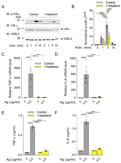 Because phosphorylation of IκB-α is a prerequisite for FcεRI-mediated cytokine production [33], we assessed this signaling pathway in BMMCs pretreated with 2.5 mM 1-heptanol. In contrast to the phosphorylation cascade in the SYK/LAT1/PLCγ1 signaling pathway in antigen-activated BMMCs (Figure 3D–I), IκB-α phosphorylation was significantly reduced in 1-heptanol-treated cells as compared to control cells at 1 and 5 min after antigen triggering (Figure 9A,B). The densitometric evaluation of the phosphorylated IκB-α was normalized to GRB2, as the levels of IκB-α are reduced upon activation [32]. The observed decrease in IκB-α phosphorylation in antigen-activated cells was associated with impaired expression of the TNFa and IL6 gene in 1-heptanol-treated cells (Figure 9C,D). As expected, the production of TNF-α and IL-6 at the protein level, as measured by bead-based immunoassay, was suppressed entirely in 1-heptanol-treated cells activated with the indicated concentrations of antigen (Figure 9E,F). These data are in accordance with a previous study showing the effects of n-alkanols on IFN-γ production in peripheral blood T lymphocytes [27].