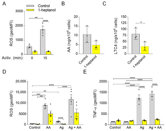 Reduced production of ROS and LTC4 in 1-heptanol-treated cells and the effect of ROS restoration by arachidonic acid on TNF-α production in BMMCs. (A) IgE-sensitized and H2DCFDA-loaded BMMCs were incubated for 15 min in the presence of a vehicle (BSS-BSA; Control; n = 3) or 2.5 mM 1-heptanol (n = 3). BMMCs were then activated with antigen (Ag; 0.5 µg/mL). Fifteen min later, the fluorescence signal was quantified by flow cytometry. (B,C) UPLC MS/MS analysis of arachidonic acid (AA; B) and LTC4 (C) from supernatants of untreated (Control; n = 3) or 1-heptanol-treated (n = 3) antigen-activated BMMCs. (D) IgE-sensitized and H2DCFDA-loaded BMMCs were prepared as in A. BMMCs were then untreated (Control; n = 5) or treated with arachidonic acid (n = 5), antigen (0.5 µg/mL; n = 5), or antigen in combination with arachidonic acid (n = 5). The fluorescence signal was quantified as above. (E) Analysis of cellular TNF-α production by flow cytometry in non-activated IgE-sensitized BMMCs (Control; n = 4), cells exposed for 1.5 h to arachidonic acid (n = 4), antigen alone (n = 4) or antigen and arachidonic acid (n = 4), and concurrently in the presence or absence of 2.5 mM 1-heptanol. Values indicate means ± SEM calculated from n, which show the numbers of biological replicates; * p < 0.05, ** p < 0.01, *** p < 0.001, **** p < 0.0001.