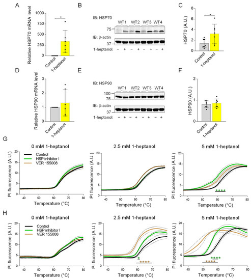 The membrane fluidizers 1-heptanol and benzyl alcohol mimic the heat stress-dependent induction of HSP70 expression [74]. Because HSP70 is a potent inhibitor of pro-inflammatory cytokine expression [75], we tested HSP70 expression in BMMCs treated with 1-heptanol. We found that cells incubated with 2.5 mM 1-heptanol exhibited increased expression of HSP70 when compared to control cells treated with the vehicle at both the mRNA (Figure 11A) and protein (Figure 11B,C) levels. Previous studies have shown that benzyl alcohol specifically induces the expression of HSP70 but not HSP90 [76]. Consistent with this finding, we found that in contrast to HSP70, HSP90 levels are unchanged in 1-heptanol-treated cells (Figure 11D–F). The data suggest that 1-heptanol triggers the heat stress response and explicitly induces the expression of HSP70 but not HSP90.