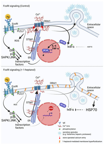 Because mast cell cytokine production is NF-κB and NFAT-dependent [32,33,34,35], we examined the role of 1-heptanol in FcεRI signaling. We studied tyrosine phosphorylation of the FcεRI-β chain and several other signal-transduction molecules, calcium response, degranulation, HSP70 expression, and production of IL-6, TNF-α, and ROS. In addition, we examined 1-heptanol-induced changes in membrane properties, such as thermal stability, lateral mobility of FcεRI, and ORAI1-mCherry and the dynamics of STIM1-ORAI1 interactions as measured by flow cytometry-based Försters resonance energy transfer (flow-FRET). Our data suggest that 1-heptanol-mediated membrane fluidization does not interfere with the earliest biochemical steps of FcεRI signaling, such as phosphorylation of the FcεRI-β chain and components of the SYK/LAT/PLCγ1 signaling pathway, instead inhibiting the FcεRI internalization and mast cell effector functions, including degranulation and cytokine production.