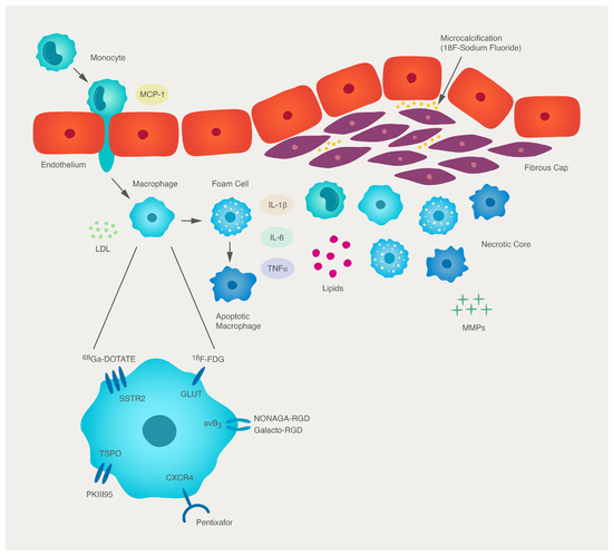 Schematic illustration of atherosclerotic plaque progression and PET radiotracer targets. Endothelial activation leads to the expression of leukocyte adhesion molecules. Chemokines, particularly MCP-1, are important in directing the intimal migration of monocytes. Resident monocytes acquire characteristics of a tissue macrophage, scavenging lipoprotein particles such as LDL. These processes give rise to the arterial foam cell, which is the result of the accumulation of lipid droplets within the cytoplasm. The foam cell secretes pro-inflammatory cytokines (IL-1β, IL-6, TNFα) that amplify the local inflammatory response. Microcalcification deposits form within the fibrous cap secondary to inflammation-driven differentiation of vascular smooth muscle cells to an osteoblast-like phenotype. MMPs can degrade extracellular matrix required for the integrity of the fibrous cap. When the plaque ruptures, blood comes into contact with tissue factor triggering thrombosis. Apoptotic macrophages contribute to the ‘necrotic core’ of the atherosclerotic lesion. Radiotracers can be used to quantify specific inflammatory processes within the plaque and be used as biomarkers of plaque vulnerability. FDG is a radio-labelled glucose analogue which is avidly taken up by metabolically active macrophages via GLUT transporters. 68Ga-DOTATE binds to SST2 receptors which are upregulated on the surface of activated macrophages. 11C-PK11195 is specific to the TSPO receptor. Pentixafor is a specific CXCR4 ligand involved in inflammatory cell trafficking to plaque. NaF is a radiotracer specific to microcalcification. αvβ3 integrin is expressed by CD68 macrophages, and radiotracers targeting this include NODAGA-RGD.