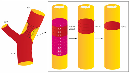 Quantification of tracer uptake may be further considered according to the maximum tracer uptake within a region of interest (resulting in SUVmax or TBRmax) or mean tracer uptake within the region of interest (SUVmean and TBRmean) [55]. Furthermore, different studies may measure the tracer uptake along the whole vessel, within the most diseased segment (as a measure of plaque uptake), or in active segments (where only arterial regions with tracer uptake above a pre-specified value are considered) (Figure 2). For example, in Elkhawad et al., a TBR threshold of ≥1.6 was used to define an active segment, as uptake below this value was associated with atheroma with <5% inflammation within the plaque [47,59]. In the analysis of culprit carotid plaque metabolic activity after acute stroke, the single hottest slice (SHS) is often taken as the measure of interest for defining plaque inflammation and is defined as the axial slice with the highest SUVmax within the plaque segment.
