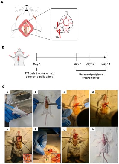 Mouse model of breast cancer brain metastases (BCBM) induced with intracarotid injection of malignant cells. Schematic representation of the common carotid artery (CCA), located laterally to the trachea, and ramified into the external carotid artery (ECA) and the internal carotid artery (ICA), which is essential for brain irrigation (A). Representation of the experimental design relying on the inoculation of breast cancer cells (4T1) into the CCA of BALB/c mice; sacrificing and organs harvesting took place 7, 10 and 14 days after cells inoculation (B). Representative images of the experimental procedure (C). Mice were anaesthetized with intraperitoneal (i.p.) injection of ketamine/medetomidine cocktail using a 25 G needle (a). After fur removal and skin disinfection, a small incision was made in the skin, and dissection of the surrounding tissue was performed to reach the CCA (b). The CCA was exposed and separated from the vagus nerve (c). Two suture lines were disposed below the CCA, a proximal and a distal one with loose knots, along with a cotton ball embedded in phosphate-buffered saline placed underneath the artery (arrow) (d). The proximal knot was tightened to block the blood flow into the point of incision (e). A cotton swab was positioned under the animal’s neck to provide better visibility of the surgical area (green arrow) and the administration of 4T1 cells was achieved using a 30 G needle (black arrow and inset) (f). After the injection of the cells, a tight knot was made in the distal line before the needle was carefully removed (g). The animal was sutured (h), placed into a heating pad until recovering conscientiousness and then moved into normal housing.