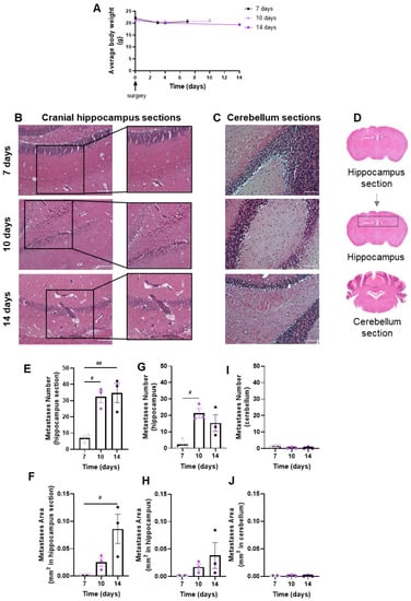 Profile of body weight and breast cancer brain metastases (BCBM) in the implemented mouse model. 4T1 cells were inoculated in the common carotid artery of BALB/c mice. Mice’s weight was evaluated to monitor the animals’ well-being throughout time until sacrifice (0 to 14 days), revealing a recovery of the slight surgery-associated weight loss (A). The pattern of BCBM formation was assessed with haematoxylin-eosin staining at different timepoints (7, 10 and 14 days). Images were taken with a 20× objective for both cranial hippocampus and cerebellum. Analysis of the cranial hippocampus sections revealed a time-dependent formation of metastases (insets) (B), while metastases were hardly detected in the cerebellum (C). Scale bar: 100 µm. Representative images of the analysed regions, namely coronal cranial hippocampus section, hippocampus region and cerebellum section (D). Quantification of metastases’ number (E) and area (F) in cranial hippocampus sections disclosed an increment throughout time. Quantification of metastases’ number (G) and area (H) in the hippocampus region revealed a significant increment throughout time. The semi-quantitative analysis of tumour number (I) and area (J) in the cerebellum revealed no significant presence of metastases. The results are expressed as mean ± SEM (n = 3 for each timepoint). A one-way ANOVA was used to assess the significant changes in parameters between indicated timepoints. For the average body weight, no significant changes were observed. Statistical significances are denoted as # p < 0.05 and ## p < 0.01 between timepoints.