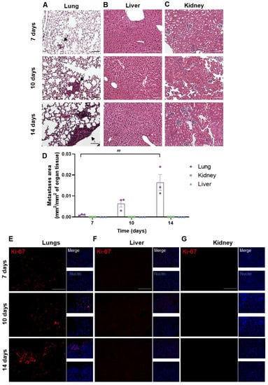 To assess whether metastases developed in peripheral organs, the lungs, kidneys and livers were harvested at different timepoints (7, 10 and 14 days) after the inoculation of 4T1 cells in the CCA. The presence of metastases was evaluated based on HE staining (Figure 3). Metastases were observed from 7 days onwards in the lungs (Figure 3A), whereas no metastases were detected in the other peripheral organs (liver and kidneys, Figure 3B,C). The metastases’ area was quantified and normalized for the analysed organ tissue area, showing an increase in tumour area throughout time in the lungs (Figure 3D). To corroborate the results obtained with HE, the Ki-67 staining of peripheral organs was performed. An increase in Ki-67-positive cells was observed from 7 days onwards in the lung parenchyma (Figure 3E), while no positive cells were found in the liver and kidneys (Figure 3F,G).