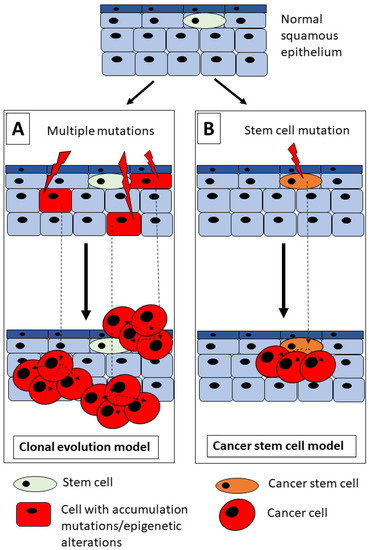 The poor prognosis of HNSCC is caused by the rapid dissemination of tumor cells to cervical lymph nodes, resistance to chemo/radiotherapy, and a high risk of local tumor recurrence [11]. Generally, initial tumors may be cured by a combination of surgery and radio/chemotherapy, but successful therapy is limited proportionally to the clinical stage of the tumor [6]. However, even if the above therapies are combined, a clinical response is observed in nearly 100% of the early tumors but only in one-third of the advanced tumors [6]. The low response of HNSCC to current treatment modalities is associated with their intratumoral heterogeneity, which reflects differences in cell subpopulations existing in the tumor tissue and explains heterogeneous sensitivity to anticancer therapy [11,12]. This heterogeneity of HNSCC seems to be a result of several independent factors like genetic mutations, environmental impact, or intracellular modifications [13]. As shown in Figure 1, two models of HNSCC tumorigenesis have been proposed that may explain the cellular heterogeneity of HNSCC: the clonal evolution model and the cancer stem cell (CSC) model of tumorigenesis [7,13,14].