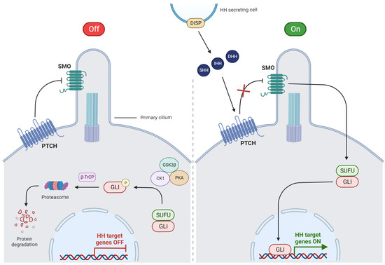 Activation of HH signaling by the canonical mechanism requires the involvement of the primary cilium with its specialized transmembrane receptors [10]. One of these receptors is PTCH1, which is placed near the primary cilium, specific structure that is exposed on the cell membrane and binds with HH ligands such as SHH, DHH, and IHH [10,27]. When one of these ligands binds to PTCH1, the receptor is internalized, causing accumulation of SMO protein in the primary cilium, which in turn signals the suppressor of fused (SUFU) to release GLI proteins. This permits GLI to translocate into the nucleus in order to start the transcription of HH target genes [10,21,28]. GLI1 is responsible for the genes associated with cell proliferation (cyclins D1, D2, and N-myc) and survival (BCL-2), while GLI2 and GLI3 have repressive functions [10,21,24]. In the absence of HH ligands, the PTCH receptor inhibits SMO protein, and the HH pathway is blocked [10]. SMO is not able to activate GLI, which remains connected with SUFU in the cytoplasm [10]. Accumulating GLI is phosphorylated by a complex of glycogen synthase kinase 3β (GSK3β), casein kinase 1 (CK1), and protein kinase A (PKA) [28]. Then, phosphorylated GLI is detected by β-transducin repeat-containing protein (β-TrCP) and directed to degradation in the proteasome. All processes of the canonical HH pathway are illustrated in Figure 2.