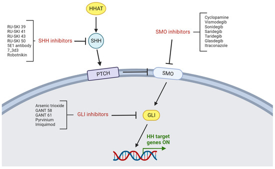 As described in Figure 5, the blockade of HH signaling may be performed with the use of inhibitors against specific proteins at each stage of the HH cascade. Based on the above, inhibitors of the HH pathway may be classified as SHH, SMO, and GLI inhibitors.