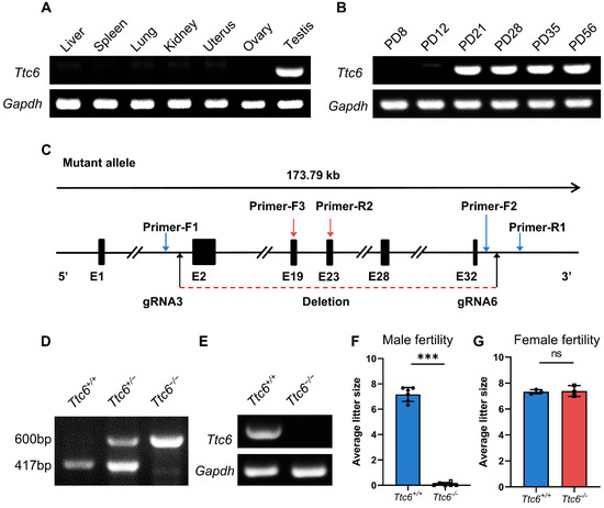 3.2. Ttc6-Knockout Male Mice Have Severe Fertility Defects