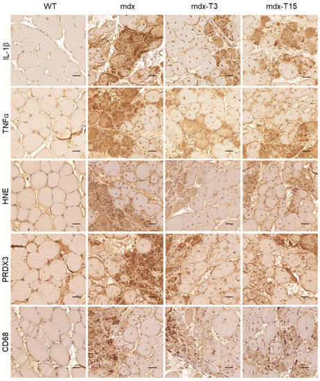 - Porter, J.D.; Khanna, S.; Kaminski, H.J.; Rao, J.S.; Merriam, A.P.; Richmonds, C.R.; Leahy, P.; Li, J.; Guo, W.; Andrade, F.H. A chronic inflammatory response dominates the skeletal muscle molecular signature in dystrophin-deficient mdx mice. Hum. Mol. Genet. 2002, 11, 263–272. [Google Scholar] [CrossRef]