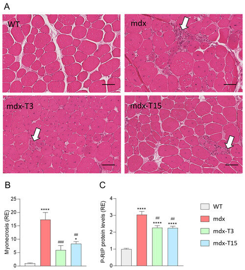 - Morgan, J.E.; Prola, A.; Mariot, V.; Pini, V.; Meng, J.; Hourde, C.; Dumonceaux, J.; Conti, F.; Relaix, F.; Authier, F.J.; et al. Necroptosis mediates myofibre death in dystrophin-deficient mice. Nat. Commun. 2018, 9, 3655. [Google Scholar] [CrossRef]