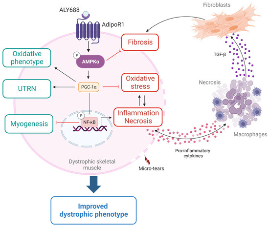Dubuisson N, Versele R, Davis-López de Carrizosa MA, Selvais CM, Noel L, Planchon C, Van den Bergh PYK, Brichard SM, Abou-Samra M. The Adiponectin Receptor Agonist, ALY688: A Promising Therapeutic for Fibrosis in the Dystrophic Muscle. Cells. 2023; 12(16):2101. https://doi.org/10.3390/cells12162101