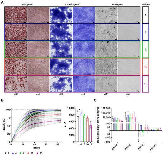- Hagmann, S.; Moradi, B.; Frank, S.; Dreher, T.; Kammerer, P.W.; Richter, W.; Gotterbarm, T. Different Culture Media Affect Growth Characteristics, Surface Marker Distribution and Chondrogenic Differentiation of Human Bone Marrow-Derived Mesenchymal Stromal Cells. BMC Musculoskelet. Disord. 2013, 14, 223. [Google Scholar] [CrossRef]