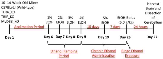 Wild-type (WT), TLR4-, MyD88-, and TRIF-global knockout (KO) mice were purchased from Jackson Laboratories (Bar Harbor, ME, USA) [30,31,32,33] (Table 1), and breeding colonies were established to produce experimental animals. All mice were bred in-house at the University of Arkansas for Medical Sciences (UAMS) in the federally approved Division of Laboratory Animal Medicine (DLAM) vivarium. All animal use protocols were approved by the UAMS Institutional Animal Care and Use Committee (IACUC). Breeders were housed on a 14:10 h light:dark cycle under controlled temperature and humidity conditions in ventilated racks, with 2 females and 1 male per cage and standard bedding, nesting material, and a polycarbonate igloo. Pups were weaned at 21 days of age and housed with 2 to 5 mice per cage until the time of experimental assignment. When male animals from each genotype reached 10 to 14 weeks in age and at least 20 g in weight, they were assigned to one of two experimental groups [Control (C) or Ethanol (E)]. At this time, experimental animals were housed individually in static cages on open-air racks, with standard bedding changed by laboratory staff weekly or as needed. Solid food was removed from the cages and water was provided ad libitum for the duration of the experiment. To begin the chronic plus binge ethanol treatment paradigm (Figure 2), mice were acclimated to the liquid diet on study days 1–5. The liquid diet was provided ad libitum via graduated glass feeding tubes using the Bio-Serv Rodent Liquid Diet, Control formulation (Flemington, NJ, USA, #F1259SP), which was prepared according to the manufacturer’s specifications. Following the 5-day acclimation period, the E group underwent a “ramping” period, in which animals received the Bio-Serv Ethanol formulation (#F1258SP) with either 1%, 2%, or 3% ethanol on study days 6, 7, and 8, respectively. The ethanol formulation was prepared using 95% v/v ethanol (ThermoFisher Scientific, Waltham, MA, USA, #AC615110010, ACS grade). On study day 9, the E-treated mice began receiving 4% ethanol for 10 days followed by 5% ethanol for an additional 7 days, which is described as the chronic ethanol administration period. Beginning on the second day of 4% ethanol administration (study day 10), the C mice were pair-fed an equivalent volume of a control diet to match the mean ethanol diet volumes consumed by the E mice on the previous day. Each afternoon around 3–5 PM CST, the liquid diets were changed. On the morning of study day 26, which is the end of the chronic administration, E mice underwent an acute “binge” administration of ethanol via gavage. At this time, the liquid diet feeding tubes were removed and standard food pellets were provided. The E-treated mice received 5 g/kg of 31.5% ethanol (v/v) diluted from 95% v/v ethanol in water, and the C group received 45% (w/v) Maltose Dextrin (Bio-Serv, 10DE Food Grade #3585) diluted in water. To ensure ethanol-treated mice recovered from the binge administration of ethanol, mice were monitored closely. Twenty-four hours following the ethanol binge administration, mice were euthanized, and tissues were harvested. This study had 17 control and 13 ethanol wild-type mice, 12 control and 12 ethanol TLR4_KO mice, 12 control and 14 ethanol MyD88_KO mice, and 10 control and 11 ethanol TRIF_KO mice. All mice used in the current study were male because our previous study indicated that ethanol induced the expression of the molecules currently studied (IL-1β, TNF-α, CCL2, and COX2) similarly in the male and female mouse cerebellum [6]. Blood ethanol concentrations were determined from a separate group of identically treated animals using an Analox AM1 alcohol analyzer as we have previously described. BECs were 230 (±59.7) mg/dL immediately following the end of the dark cycle on the last day of 4% ethanol treatment; 311.7 (±49.8) mg/dL at the end of 5% ethanol treatment; and 718 (±6.9) mg/dL 90 min following ethanol bolus [6].