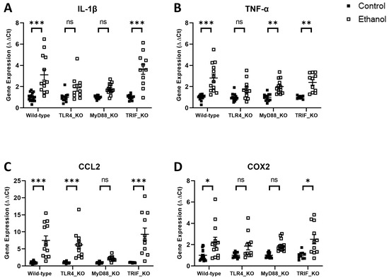 Two-way ANOVA for IL-1β, TNF-α, CCL2, and COX2 in the cerebellum of wild-type, TLR4-, MyD88-, and TRIF-deficient mice. GraphPad Prism 9 was utilized to perform ordinary two-way analysis of variance (ANOVA) as described in the Methods. The main effects of treatment (control or ethanol) and genotype (wild-type or TLR4_KO, MyD88_KO, or TRIF_KO) and their interaction were evaluated. p values <0.05 were considered significant. *** p < 0.001, * p < 0.05, ns = not significant.