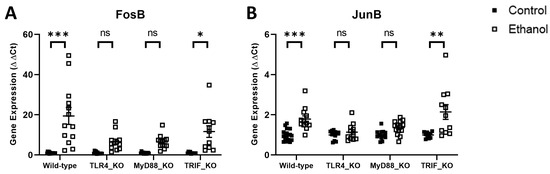 Effects of ethanol on FosB (A) and JunB (B) mRNA expression in the cerebellum of wild-type, TLR4-, MyD88-, and TRIF-deficient mice. Mice were given access to a control or ethanol liquid diet, as described in the Methods, and relative mRNA expression was measured using qRT-PCR. Results are expressed as ∆∆CT fold change relative to control for each genotype. Individual values for each sample were plotted and error bars denote mean +/− SEM. *** p < 0.001, ** p < 0.01, * p < 0.05, ns = not significant.