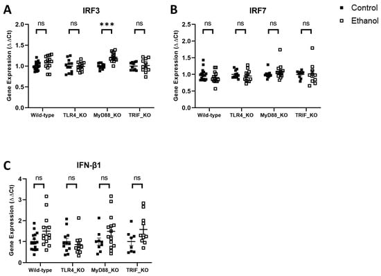 The transcription factor IRF3 is an important product of the TRIF signaling pathway. IRF3 and the related transcription factor IRF7 activate the transcription of genes encoding Type I interferons, including IFN-β1. Ethanol effects on IRF3, IRF7, and IFN-β1 were evaluated in wild-type versus TLR4-, MyD88-, or TRIF-deficient mice consistent with the analyses above. Two-way ANOVA revealed no significant difference among the factors of treatment, genotype, or their interaction for IRF3 or IRF7 in wild-type versus TLR4_KO, MyD88_KO, or TRIF_KO mice, except for IRF3 in wild-type versus MyD88_KO mice (Table 5). Two-way ANOVA revealed a significant difference between the factors of genotype and interaction for IFN-β1 in wild-type versus TLR4_KO mice, and for the factor of treatment in wild-type versus MyD88_KO and TRIF_KO mice (Table 5). Tukey’s multiple comparisons test, however, demonstrated that ethanol did not significantly alter the mRNA expression of IRF3, IRF7, or IFN-β1 in ethanol-treated wild-type (p = 0.31, p = 0.42, p = 0.09), TLR4_KO (p > 0.99, p = 0.89, p = 0.93), MyD88_KO (p < 0.001, p = 0.66, p = 0.32), or TRIF_KO (p > 0.99, p > 0.99, p = 0.21) mice compared to their respective controls, with the exception of IRF3 in MyD88_KO mice (Figure 5). This further suggests that ethanol may not induce neuroinflammation through the TIRIF-dependent pathway.