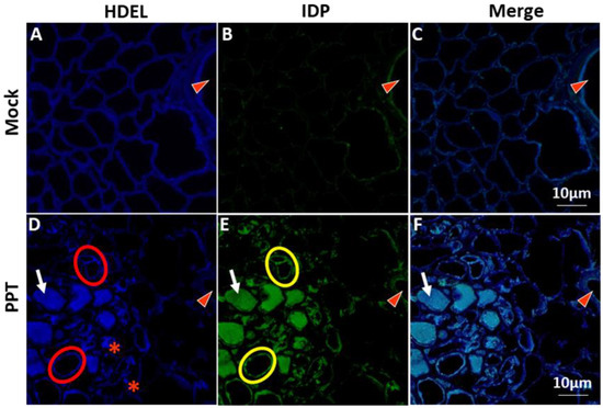 Confocal microscopy for visualization of the immunostained endoplasmic reticulum (ER) network and potato purple top (PPT) phytoplasmas in tomato plants. The figure provides critical visual evidence of the cellular interactions between the immunostained ER network and PPT phytoplasmas in tomato plants. (A–C) mock control plants; (D–F) PPT-phytoplasma-infected tomato plants. HDEL, as the marker of ER lumen, was used to visualize the ER network structure in mock control (A) and infected (D) plants. Immunostaining was performed using an anti-HDEL antibody and a secondary antibody conjugated with Alexa Fluor™ 488 (Blue). The distribution and colonization of PPT phytoplasmas were observed in mock control (B) and infected (E) plants. Immunostaining was conducted with an anti-immunodominant membrane protein (IDP) antibody and a secondary antibody conjugated with Alexa Fluor™ 405 (green). (C,F) are the merged images of (A) and (B), and (D) and (E), respectively. Red triangles indicate the xylem tissues. White arrows indicate aggregated protein structures. In some infected phloem cells (sieve element and/or companion cell, represented by red circles in (D)), the HDEL signals were detected on the edge of the cell, appearing to be anchored to the plasma membrane. IDP signals were also detected near the plasma membranes in the same cells represented by yellow circles in (F). In some instances, HDEL signals were found within the cytoplasm of the cell (indicated by the red asterisk). Scale bar = 10 µm.